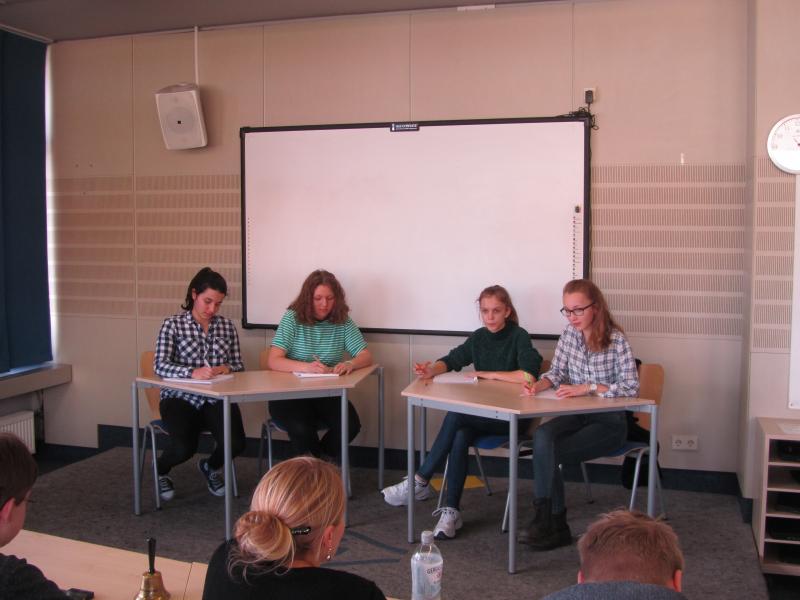 Für Amelie (im Foto oben rechts) galt es zunächst, sich in zwei Vorrundendebatten gegen 19 Schülerinnen und Schüler aus Bingen, Ingelheim, Nackenheim, Stromberg, Worms und Mainz durchzusetzen und als eine der vier Punktbesten ins Regionalfinale einzuziehen. Amelie debattierte in der Vorrunde über die Streitfragen „Sollen grundsätzlich auch Nicht-Pädagogen in der Schule unterrichten?“ und „Soll das Reparieren von Elektrogeräten Unterrichtsfach werden?“. Schnell zeigte sich, dass die Konkurrenz in diesem Jahr besonders stark war, sodass die Finalteilnahme kein Selbstläufer werden würde. Deshalb war die Freude besonders groß, als feststand, dass Amelie es tatsächlich zum dritten Mal in Folge geschafft hatte, ins Regionalfinale einzuziehen. Das allein ist schon eine beeindruckende Leistung!