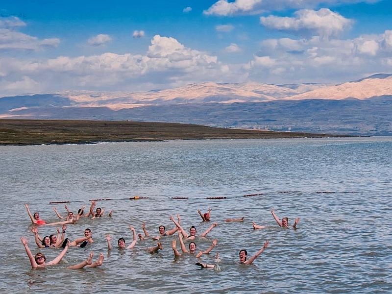 Besonderes Highlight der Reise war der Tag in der Wüste Israels. Die Felsenfestung Masada erweckte bei Herrn Lohmann die Lust, Selfies zu machen. Im größtenteils wegen Regen gesperrten Naturpark En Gedi wurde eine Gruppe pubertärer Jungs von den Mädchen beim Baden observiert, während die Lehrer die Zeit nutzten, um wieder mal zu essen. Andere besuchten Souvenir Shop Nummer 125. Leander erfreute sich an Qumran, wo „ein kleiner Beduine“ alte, heilige Schriften gefunden hat und bezeichnete den Jungen als Helden. Weiterfahrt ans Tote Meer. Fast alle gingen baden, bis auf Herrn Konrad, der nicht mal eine Badehose eingepackt hatte. Tabea hatte anfangs Startschwierigkeiten, da sie sofort Salzwasser ins Auge bekam. Als dann alle im 33%igen Salzwasser schwebten, wurden von außen Erinnerungsfotos geknipst. Einige nutzen auch den Schlamm am Meeresboden, um der Haut ein besonderes Wellnessprogramm zu bieten. Hierbei denken wir besonders an das Schlammmonster Nils, der schnell noch Sophia umarmte, bevor es zu den Duschen ging. Die Rückfahrt in die Unterkunft wurde von Cicely und Christine genutzt, um Quizduell zu spielen, der Rest der Reisenden machte lieber wieder ein Schläfchen. Schließlich waren die Nächte, bedingt durch Werwolfspielen mit Frau Frey, Madagaskarschauen oder Weintrinken, sehr kurz.