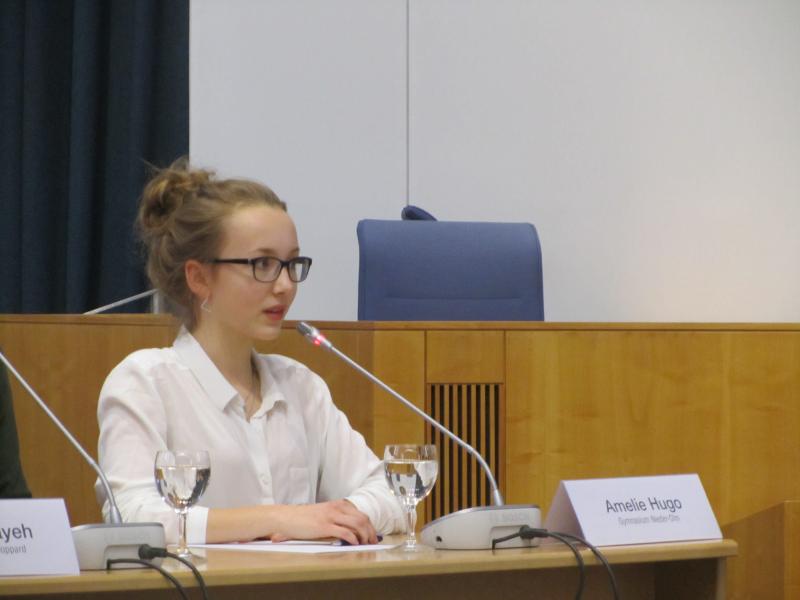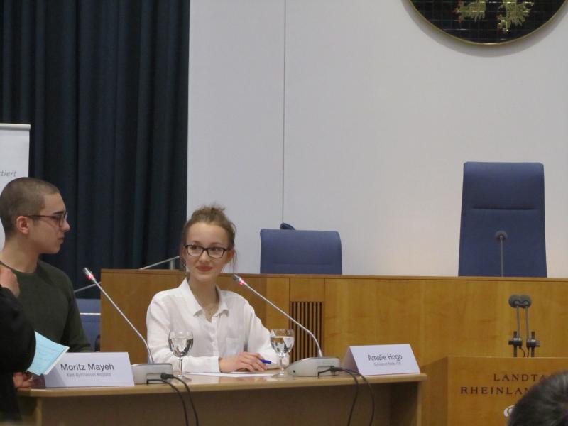 Das Thema der Finaldebatte lautete: „Sollen außerhalb von Schulabschluss und Schulwechsel Notenzeugnisse durch Berichtszeugnisse ersetzt werden?“ Amelie vertrat gemeinsam mit einem Schüler des Kant-Gymnasiums Boppard die PRO-Seite und musste sich auf der CONTRA-Seite mit zwei Schülern des Görres-Gymnasiums Koblenz und der IGS Goetheschule Kaiserslautern auseinandersetzen. Während den anderen Finalteilnehmern die Nervosität zum Teil deutlich anzumerken war, debattierte Amelie auf der großen Bühne des Mainzer Landtags unter Beobachtung von Presse und Politprominenz (u.a. Landtagspräsident Hendrik Hering) unheimlich souverän und abgeklärt. Die Jury lobte besonders ihr bemerkenswertes Ausdrucksvermögen und honorierte, dass sie die Debatte durch neue Aspekte immer wieder vorangebracht habe. Der verdiente Lohn für diese hervorragende Leistung war der zweite Platz im Landesfinale und der damit verbundene Einzug in den Bundeswettbewerb von „Jugend debattiert“, der am 21. und 22. Juni in Berlin stattfindet. Als Preis erhält Amelie zusätzlich ein fünftägiges Rhetorikseminar, das sie gemeinsam mit den Siegerinnen und Siegern der anderen Länder auf den Bundeswettbewerb vorbereitet.