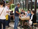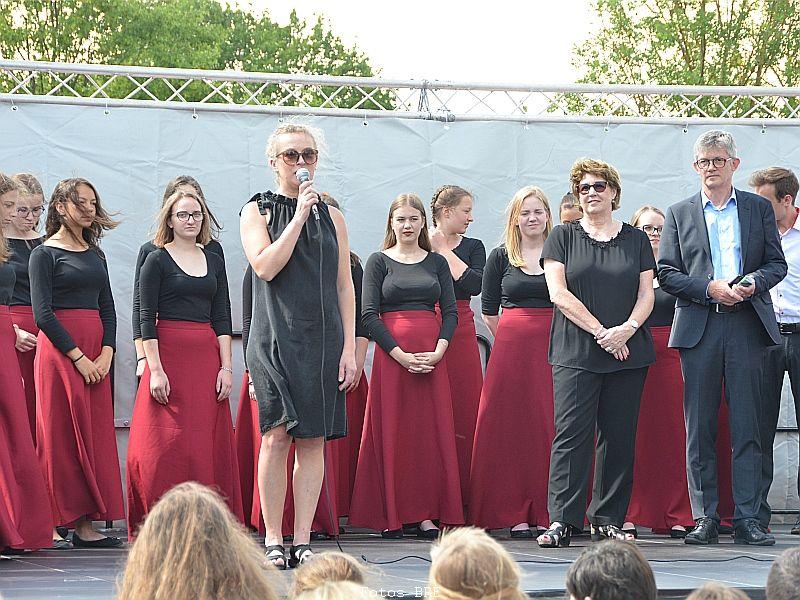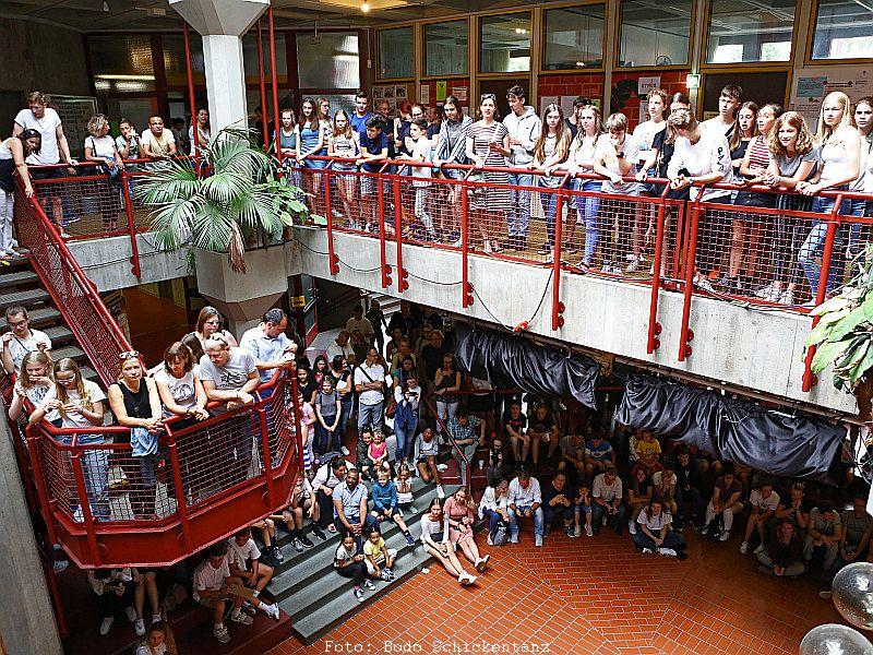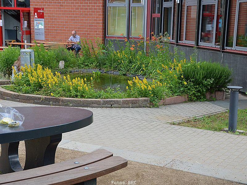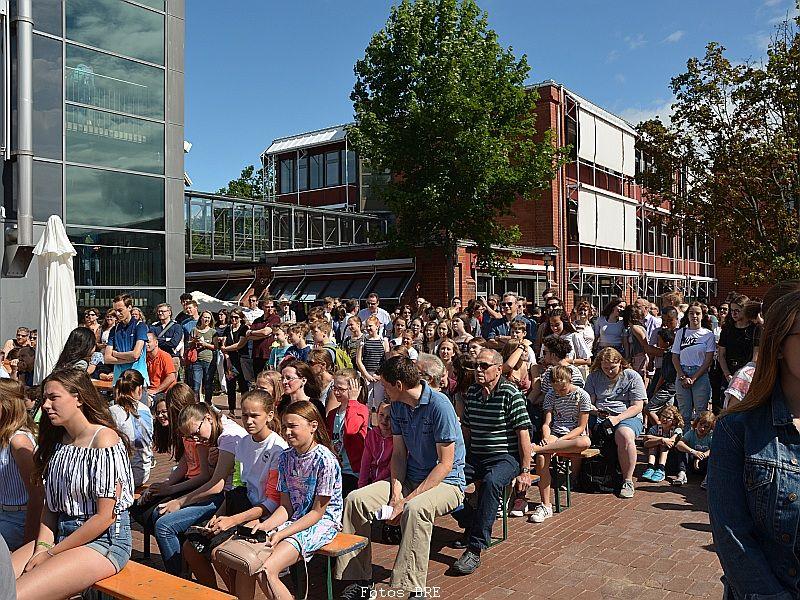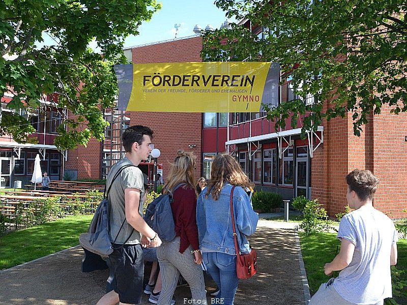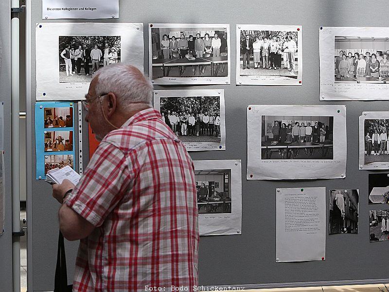 Den Ehemaligentreff im Anschluss an das Schulfest organisierte die Schulleitung gemeinsam mit dem Förderverein. Etwa 300 ehemalige Schülerinnen und Schüler sowie Kolleginnen und Kollegen genossen die schöne Abendstimmung, tauschten alte Schulgeschichten aus und konnten das jetzige Gymnasium bestaunen ... nach 40 Jahren ist vieles nicht mehr so wie zu den beschaulichen Anfangszeiten, die anhand von Fotos in einer kleinen Ausstellung zu besichtigen waren.