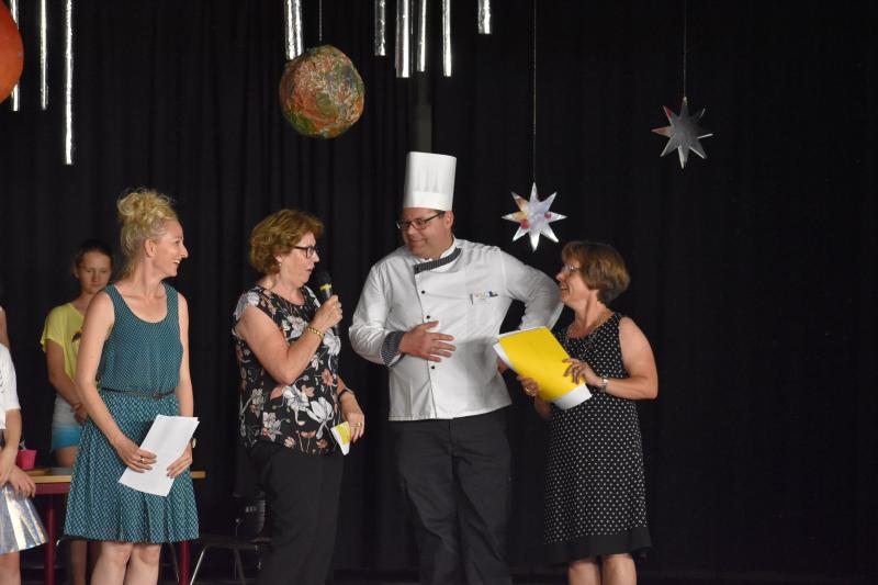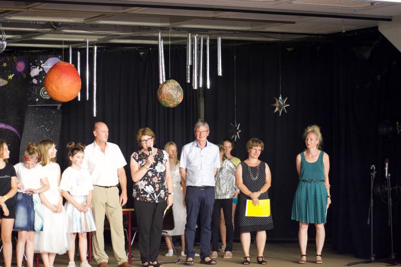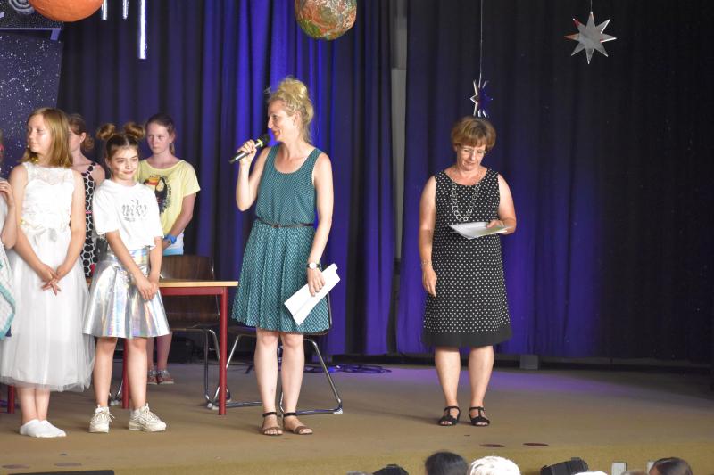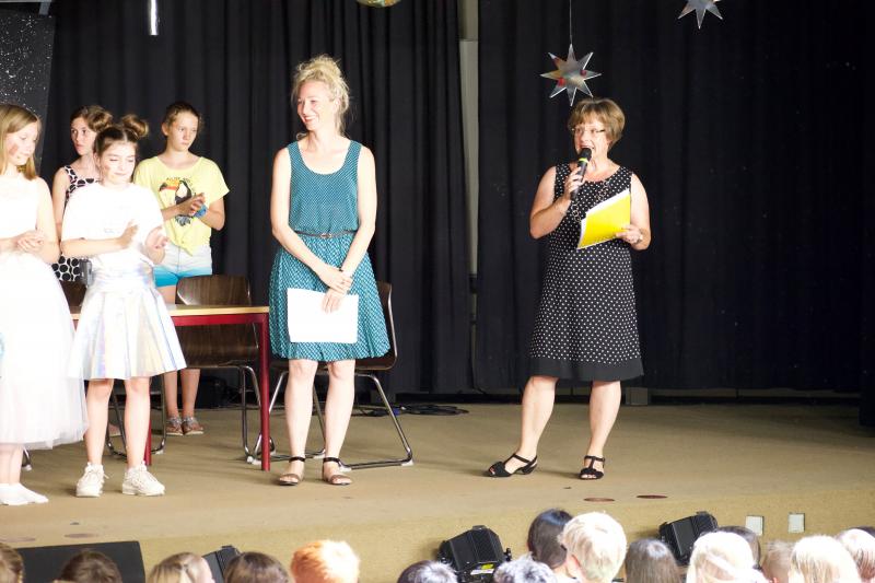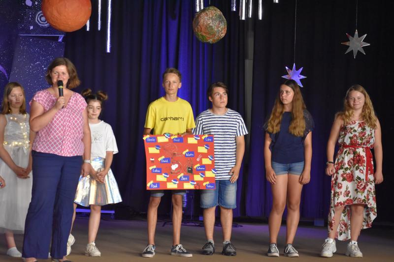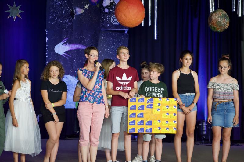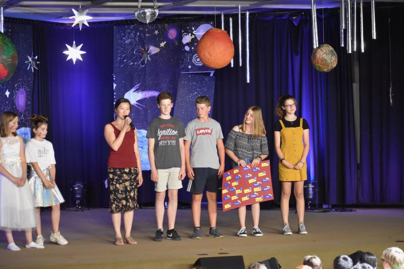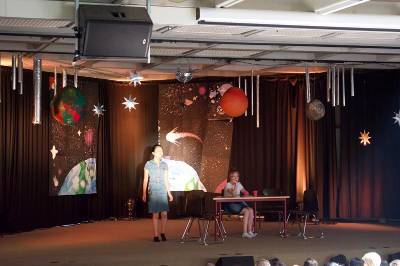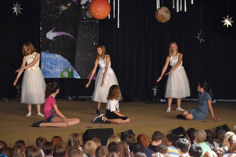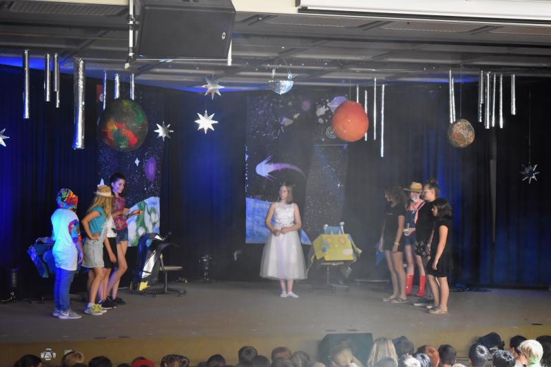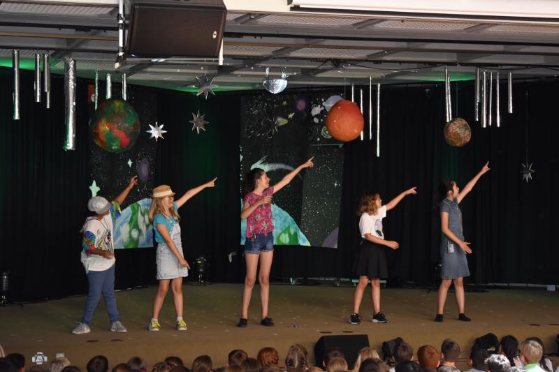 Die Aufnahmefeier für die Schülerinnen und Schüler der neuen 5. Klassen fand am letzten Donnerstag vor den Ferien im Foyer von Haus A statt. Die zukünftigen Fünftklässler wurden bereits draußen von der Nachwuchs-Big Band musikalisch begrüßt. Auch im Foyer ging es musikalisch weiter. Schülerinnen und Schüler der Ganztags-AG „Musical“ führten das Stück „Ufo – Kein Wunsch ist schnuppe“ auf.