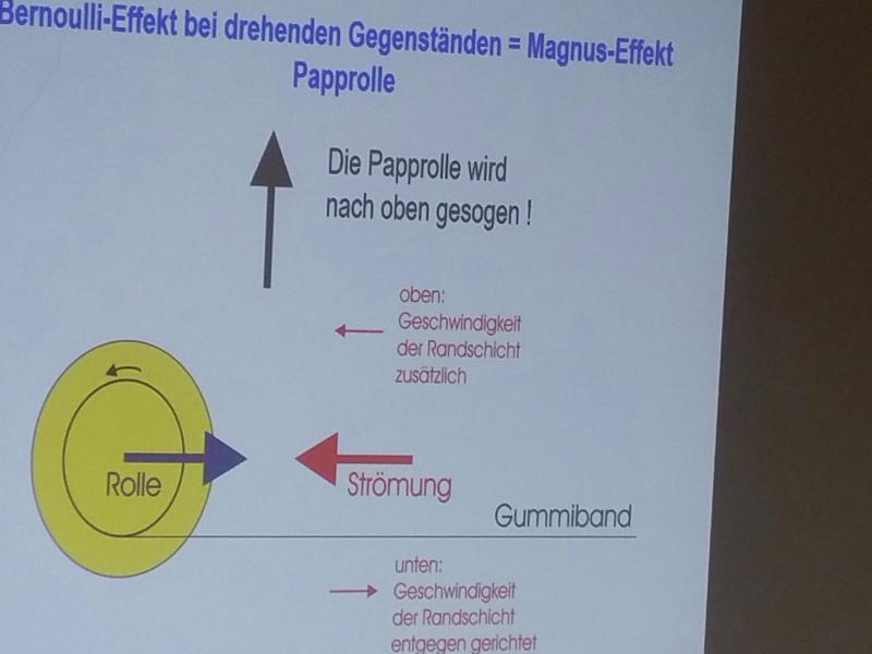 Wir haben an verschiedenen Vorlesungen teilgenommen. So gab es eine Experimentalvorlesung zum Thema Luftdruck. Wir haben dabei etwas zum statischen Auftrieb, der Coriolis-Kraft, dem Magnus-Effekt und dem dynamischen Auftrieb gehört.