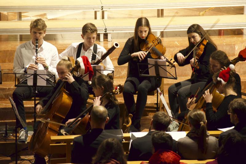 Beginnend mit dem Halleluja aus Händels Messias spannte sich ein weiter Bogen mit wunderbaren Klängen, insbesondere die der Vokalgesänge des Kammerchors begleitet vom Olag-Ensemble, bis zum beeindruckenden, wellenartigen Gesang von „Luminious Night of the Soul“, dem musikalischen Höhepunkt des Abends, bei dem der Oberstufenchor von den Ehemaligen und dem Olag-Ensemble unterstützt wurde.