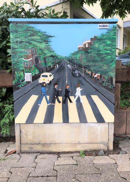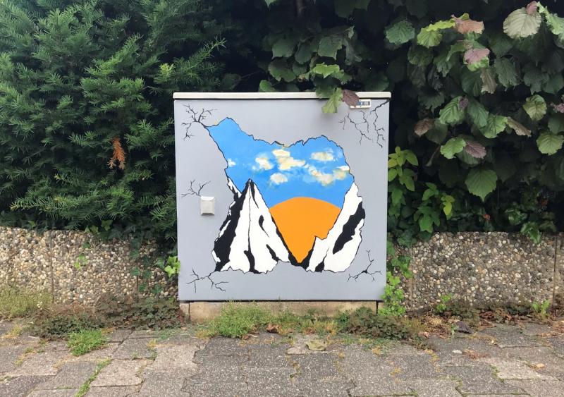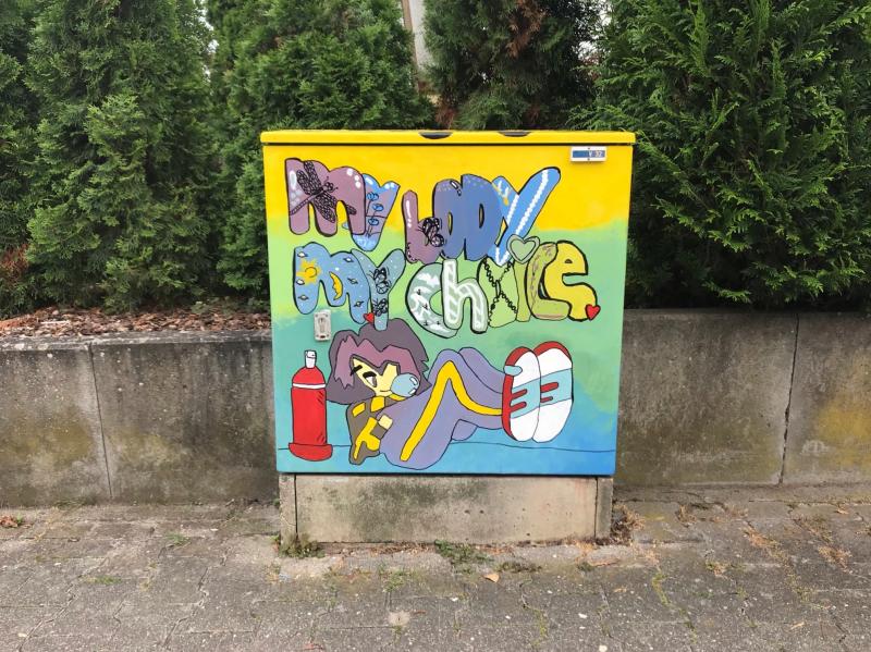 Johanna Neff ließ sich vom berühmten Abbey Road Plattencover der Beatles inspirieren und gestaltete zusammen mit Talesia Grippaldi den Stromkasten an der Karl-Sieben-Straße / Lindenstraße. Mila Cifelli bereicherte den Stromkasten am Maler-Metten-Weg mit einem Durchblick auf einen Sonnenaufgang, sie wurde unterstützt von Alina Overhaus. „My Body my Choice“ ist ein Graffiti-Schriftzug, den die Schülerinnen Emilia Kipping, Dana Heer, Maria Souza, Nelly Bai, Charlotte Stahmann und Amy Hotz in Regenbogen-Optik auf den Kasten in der Karl-Sieben-Straße aufgemalt haben. Gegenüber des Haupteingangs des Gymnasiums gestaltete die Abiturientin Anuschka Beneke den Stromkasten mit einem Motiv, das in der aktuellen Corona-Situation Hoffnung macht. Igel und Fuchs halten ein Schild mit der Aufschrift „Hope“ hoch, während die uns allseits begleitenden OP-Masken auf dem Boden liegen.