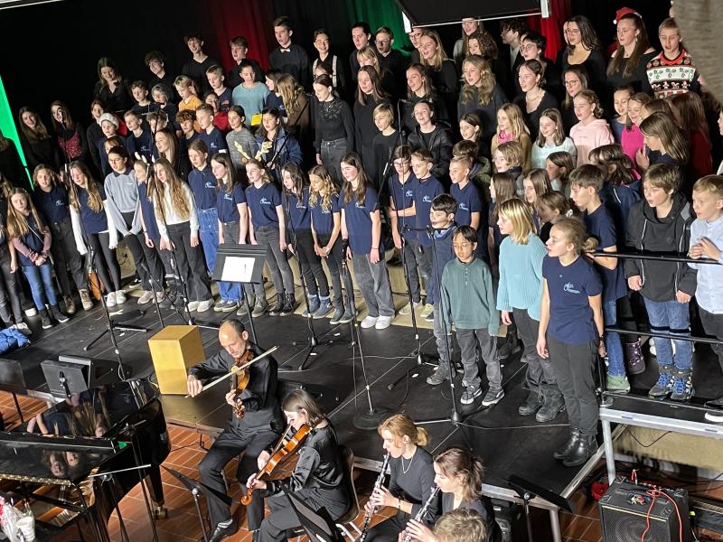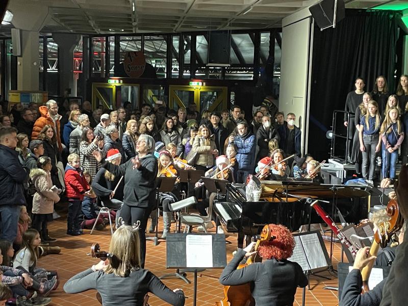 Am Mittwochabend, den 21. Dezember 2022 fanden sich zahlreiche Besucherinnen und Besucher zum diesjährigen Adventskonzert aller Sängerinnen und Sänger, des Orchesters und der Bigband in der großen Eingangshalle ein. Bei stimmungsvoller Musik genossen die Zuhörerinnen und Zuhörer die lockere Atmosphäre mit den Gerüchen des Weihnachtsmarktes nach Punsch, Waffeln und Bratwurst.