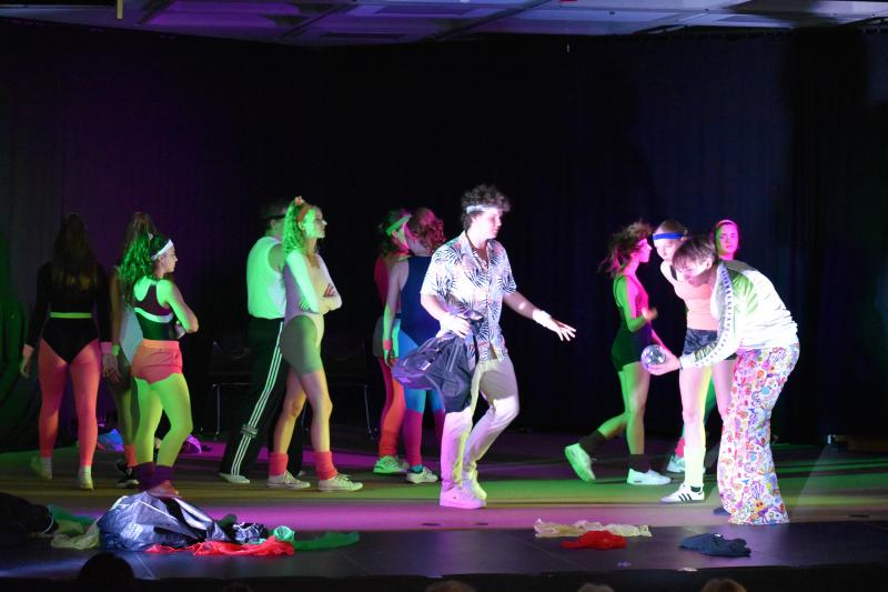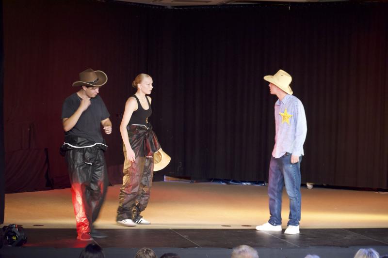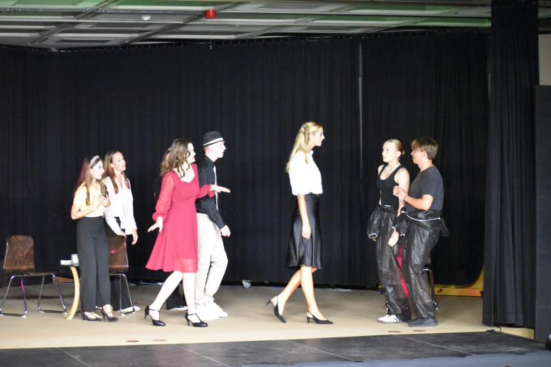 In einer Szene noch Cowboy, in der nächsten König, von Oscar-Preisträgerin und Kameracrew zu Aerobic-Trainerin und Hofgefolge, vom Kellner zum Disco-Tänzer, vom General zum ränkeschmiedenden Kammerdiener; so flexibel agieren die Schüler*innen dabei, alle sind involviert, aktiv, nicht nur darstellerisch, auch hinter der Kulisse oder im Umbau.