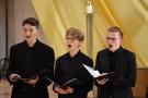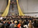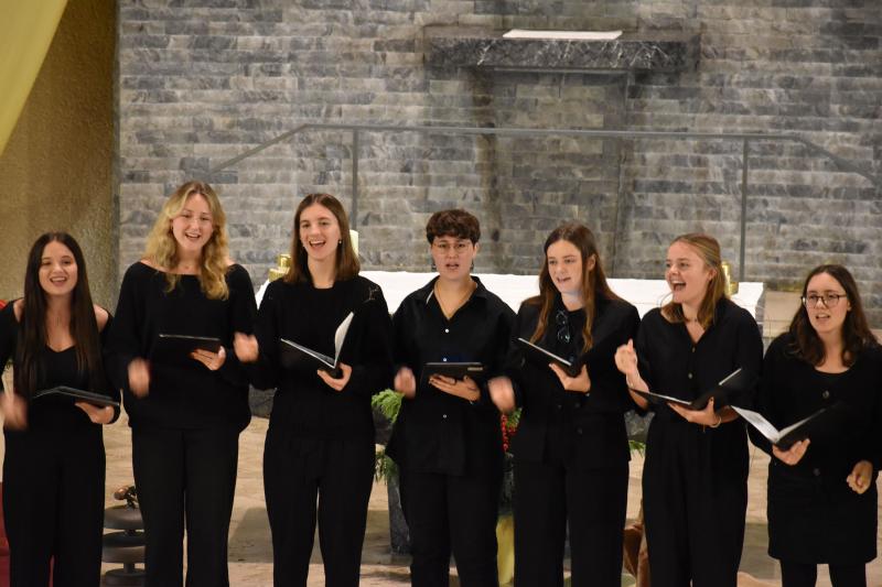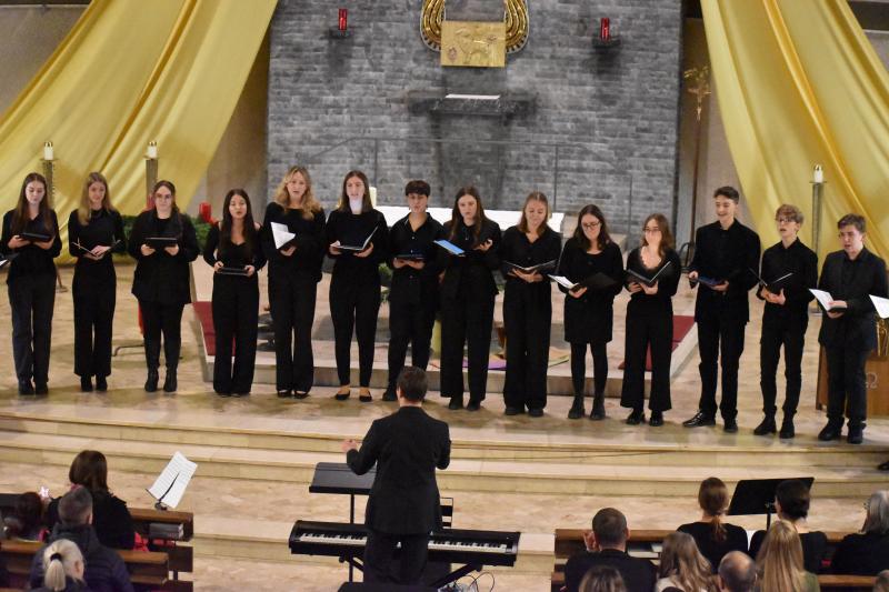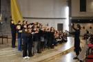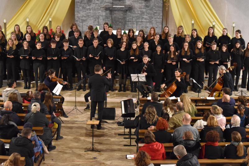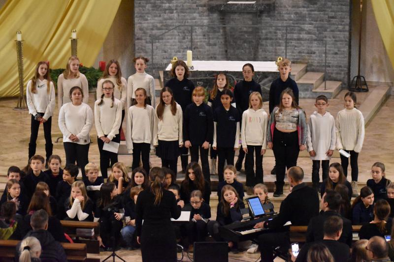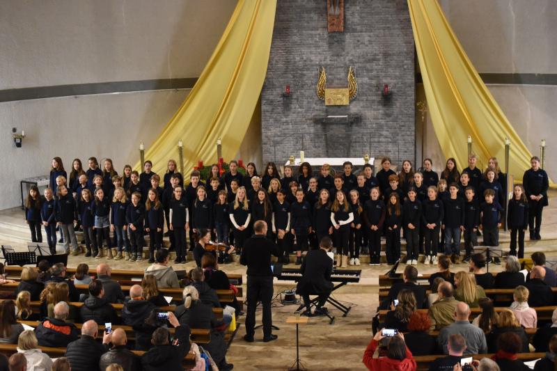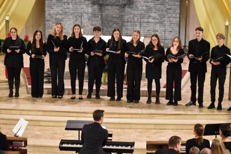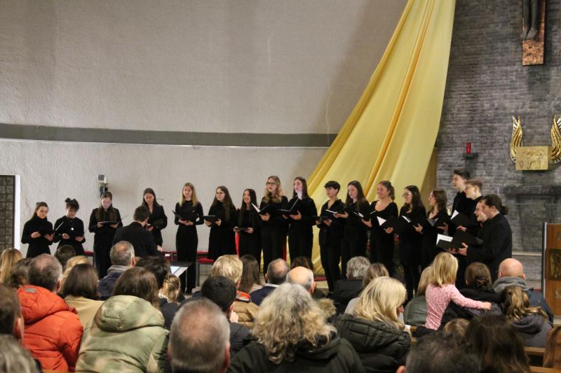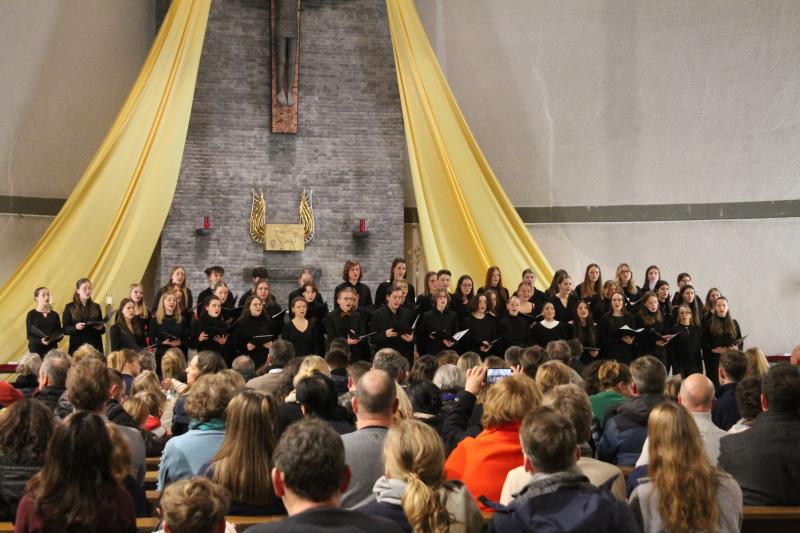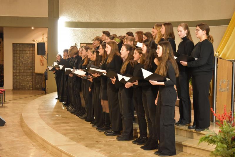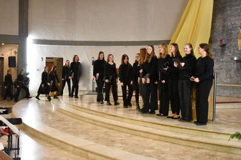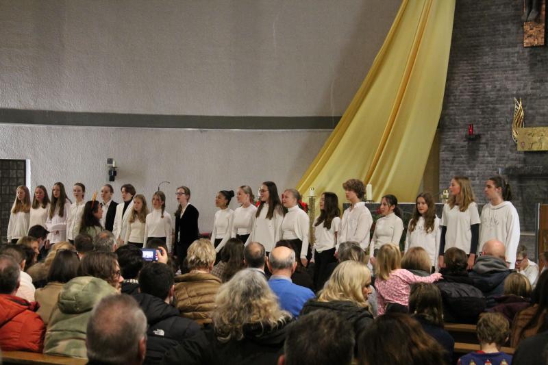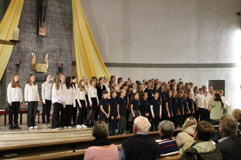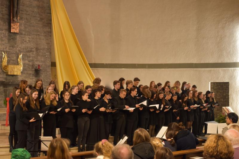 Mittwochs eröffneten dann die Gesangsklasse 6a (Leitung: Herr Bolender) und 6b (Leitung: Frau Ibata) das Konzert, die in einem bis zu dreistimmigen Gesang und einer klaren Intonation zeigten, welche Entwicklung in der Gesangsarbeit nach mehr als einem Jahr möglich ist. Die Klasse 6b präsentierte dann auch noch ein Lied mit dem Mittelstufenchor (Leitung: Frau Ibata) zusammen, welcher im Anschluss in zwei geistliche Werke mit einer herausragenden Stimmgewalt den ganzen Kirchenraum beherrschte. Der Kammerchor des Mittelstufenchores zog am Ende des Blocks noch einmal mit einem bekannten Stück der Filmmusik alle in den Bann.