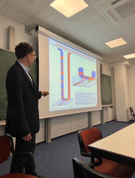 Im Anschluss daran ging es mit einem Vortrag von Prof. Dr. Kläui über die aktuellen Forschungen seiner Arbeitsgruppe weiter. Hierbei ging es vor allem um die Möglichkeit, energieeffizientere Magnete zu finden und diese in Alltagsgegenständen zu verbauen, sodass die Energiewende vorangetrieben werden kann.