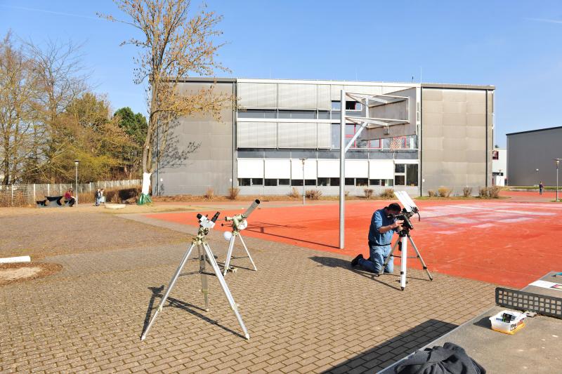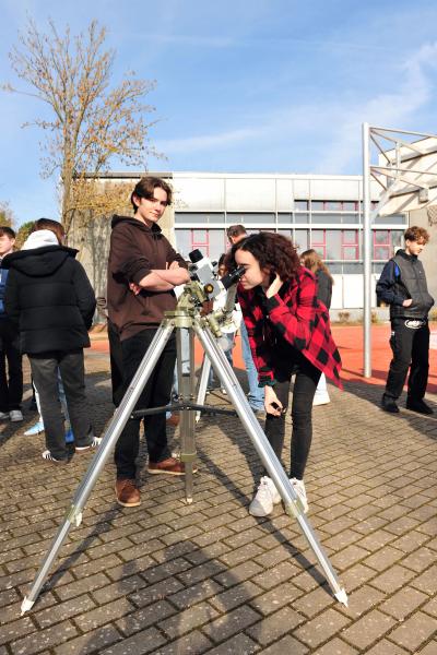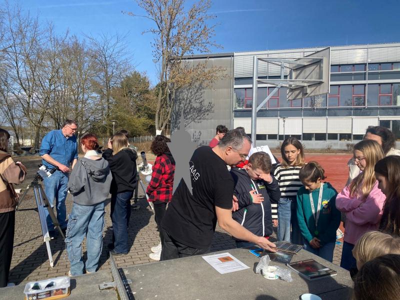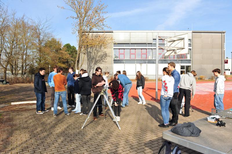 Die Schülerinnen und Schüler der Astro-AG, mehrere Physik-Kurse der Oberstufe, die Ganztagsklasse sowie viele vorbeigehende Schülerinnen und Schüler nutzten dieses Angebot nach der 6. Stunde und im Laufe des Nachmittags. Auch interessierte Lehrerinnen und Lehrer kamen hinzu.