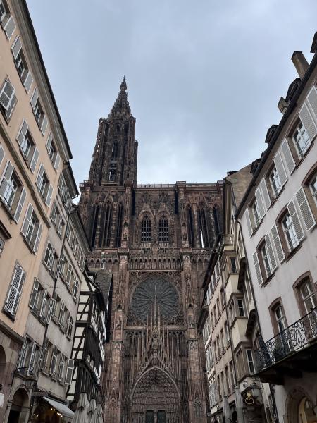 Die Schülerinnen und Schüler machten sich unter Führung von Frau Brunn und Frau Hirsch auf den Weg durch die Straßen zur „Petite France“ und schließlich zum Straßburger Münster. Dort jedoch stellten die Schülerinnen und Schüler fest, dass das Münster soeben geschlossen wurde und erst in einigen Stunden wieder öffnen würde. Die nächste Station war erfolgreicher, denn die Schifffahrt durch Straßburg startete wie geplant um 12:00 Uhr. Vom Wasser aus hatten wir einen beeindruckenden Blick auf die Fachwerkhäuser der Altstadt und konnten auch die modernen Gebäude des europäischen Viertels betrachten. Nach knapp einer Stunde Fahrt legte das bateau mouche wieder am Anlegeplatz an.