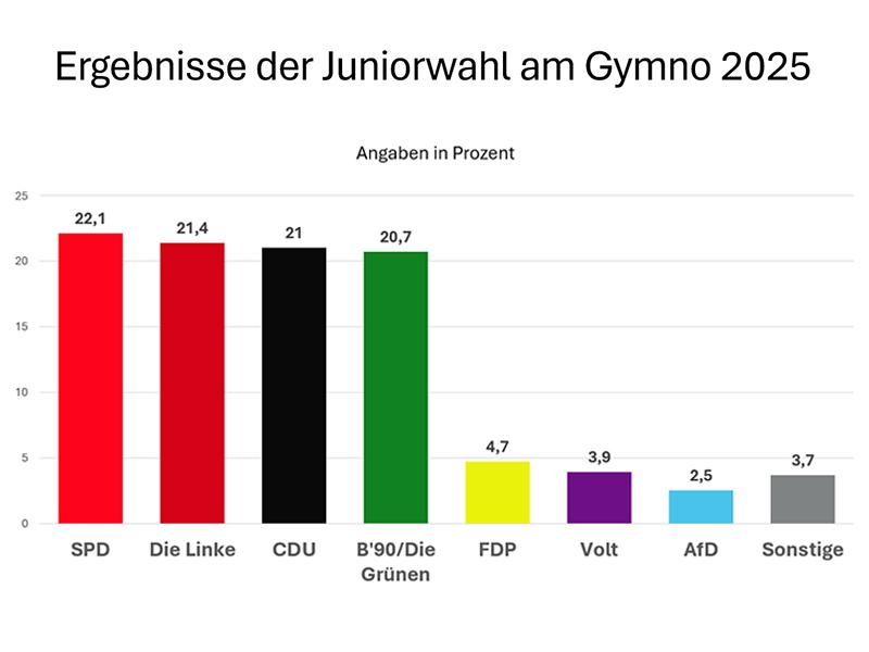 Mit Ausnahme der konservativen CDU (21 %), die insgesamt auf dem dritten Platz landete, konnten sich bei der Juniorwahl am Gymno ganz überwiegend Parteien aus dem linken Spektrum vorne platzieren: neben der bereits erwähnten SPD (22,1%) waren dies Die Linke (21,4%), Bündnis 90/Die Grünen (20,7%), und die gesamteuropäische Kleinpartei Volt (3,9%). Für die FDP (4,7%), die AfD (2,5%) und das neugegründete Bündnis Sarah Wagenknecht (1,1%) reichte es nicht für den Einzug ins Parlament. Eine Regierungsbildung wäre unter diesen Umständen sicherlich deutlich einfacher zu bewerkstelligen, als dies bei den richtigen Bundestagswahlen zu erwarten ist.