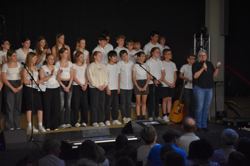 Den Abschluss gestaltete der Mittelstufenchor unter der Leitung von Frau Ibata, begleitet von Herrn Janson am Klavier sowie den Schülern Johann am Schlagzeug, Max an der Gitarre und Valentin am Klavier. Die drei Instrumentalisten überzeugten mit sicherem Rhythmusgefühl und feinem Gespür fürs Zusammenspiel. Der Chor selbst beeindruckte durch Klangtiefe, Präzision und Ausdrucksstärke – Stück für Stück wuchs hier eine musikalische Spannung, die den ganzen Raum füllte und den Abend eindrucksvoll abrundete.