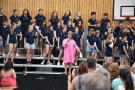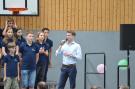 Kurz vor den Sommerferien fand die Aufnahmefeier der neuen fünften Klassen statt. Die Turnhalle war geschmückt und die Klassenleitungen nahmen „ihre“ neuen Kinder direkt auf kleinen Matteninseln am Rand in Empfang. Jedes Kind erhielt einen kleinen, selbstgebastelten Buntstift aus Papier mit seinem Namen zum Anstecken.