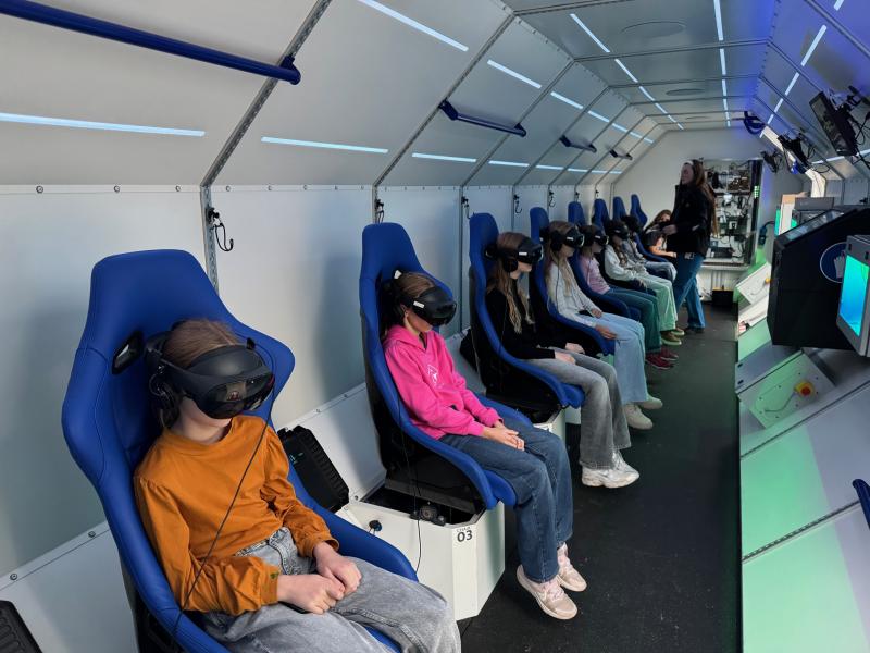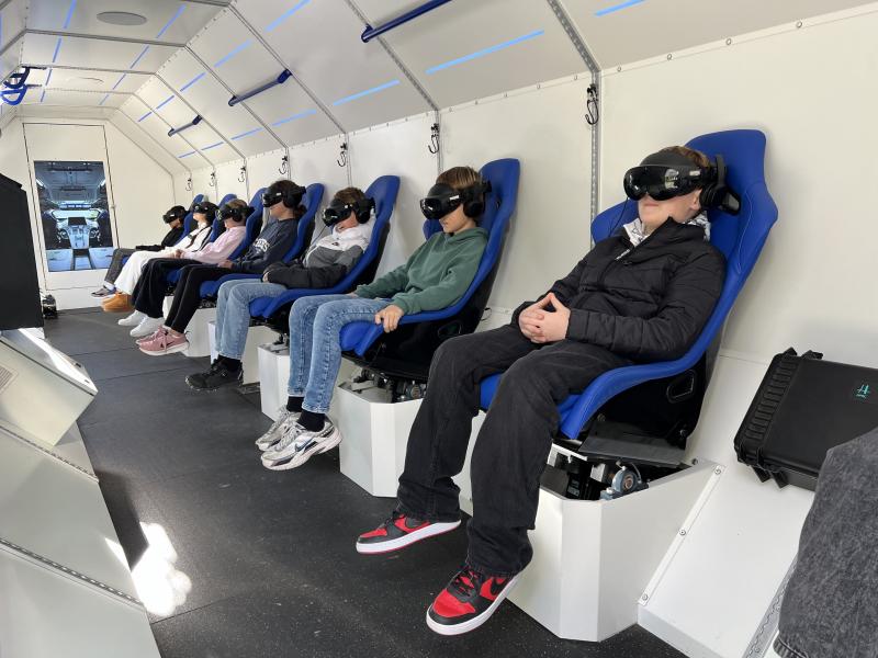 Der Spacebuzz One, ein LKW mit Anhänger in Raketenform der Deutschen Raumfahrtagentur, wartete auf dem Parkplatz hinter der Turnhalle auf die Schülerinnen und Schüler. Nach einer kurzen Einweisung wurden alle mit VR-Brillen ausgestattet und konnten gemeinsam mit den beiden deutschen Astronauten Alexander Gerst und Matthias Maurer einen unvergesslichen virtuellen Flug in den Weltraum unternehmen. Dabei lernte man viel über unseren schönen Heimatplaneten und dass wir ihn schützen müssen. Danach wurde kurz auch der Mond besucht und zum Schluss der Reise sind wieder alle sicher auf der Erde gelandet.