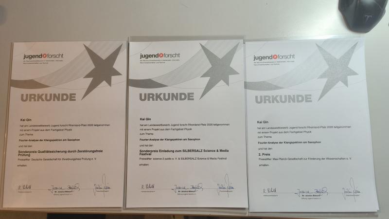Beim Landeswettbewerb „Jugend forscht“ in Rheinland-Pfalz, der auf dem Gelände der BASF in Ludwigshafen stattfand, konnte Kai mit seinem Projekt „Fourier-Analyse der Klangspektren am Saxophon“ auch auf Landesebene überzeugen. Mit seiner gelungenen Verbindung von Physik und Musik erreichte er im Fachgebiet Physik den zweiten Platz.